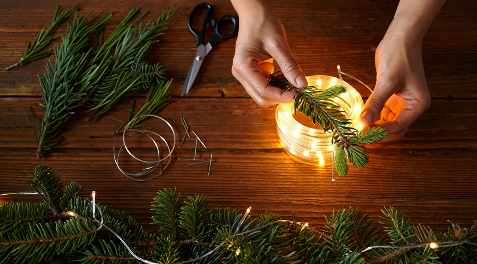 Оберните хвойное украшение нитью светодиодных огней по спирали — иголки сами удержат провод. Тёплый белый свет на фоне зелёной хвои смотрится очень уютно.