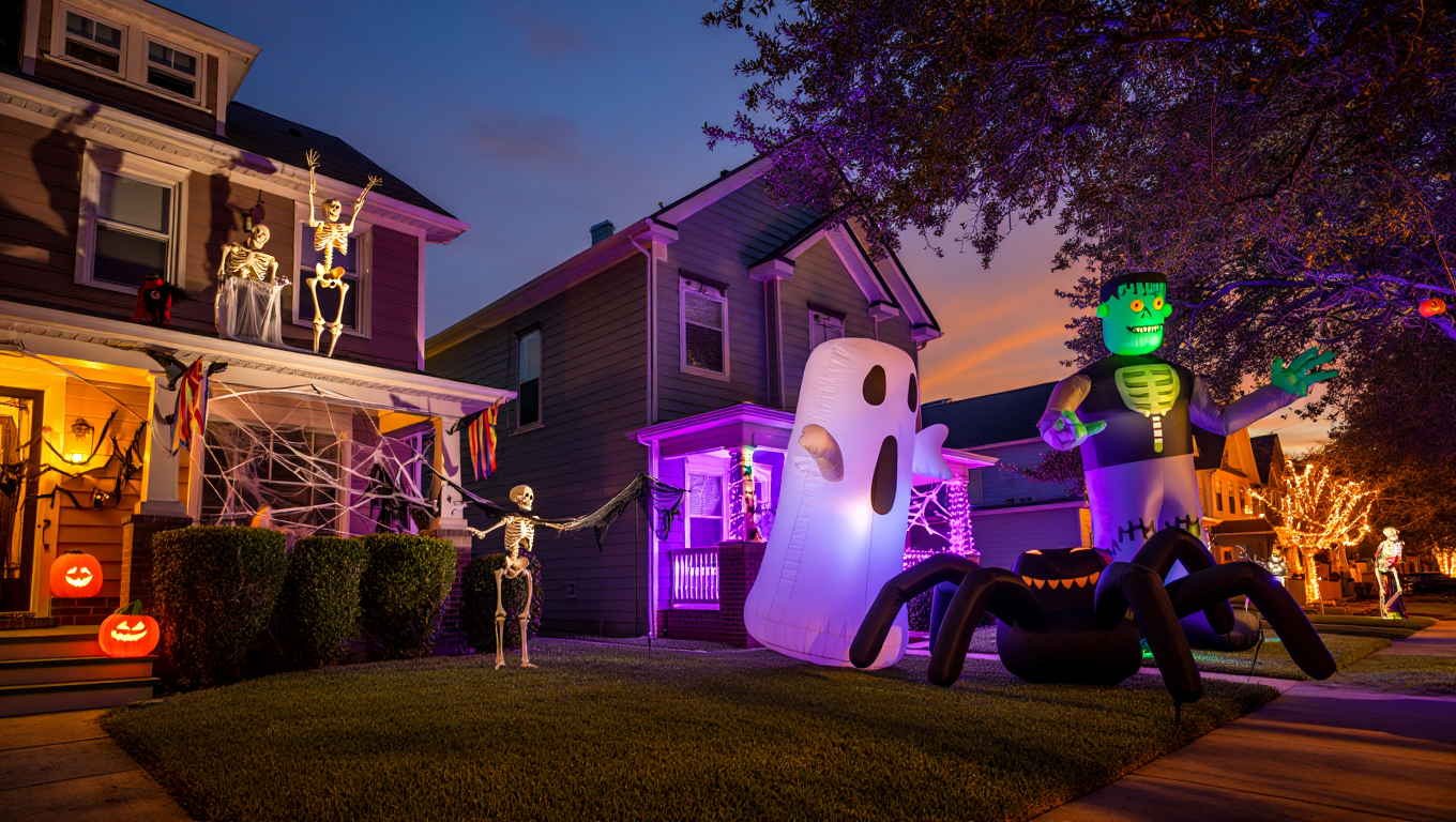 Расставьте светящиеся тыквы вдоль дорожки, развесьте гирлянды на деревьях, установите надувные фигуры. Главное — надежно все закрепить.