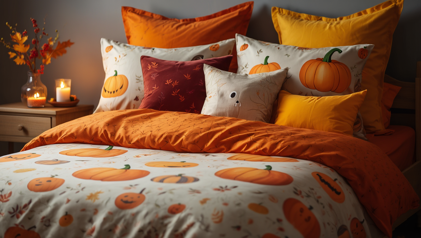 В спальне можно обойтись минимумом украшений, особенно если в доме есть маленькие дети, которые могут испугаться. Смените постельное белье на комплект с тыквами или призраками, добавьте пару декоративных подушек. Поставьте на прикроватную тумбочку ароматическую свечу с запахом корицы или тыквенного пирога — такие ароматы создают осеннее настроение. Небольшая композиция из искусственных листьев и ягод дополнит оформление.