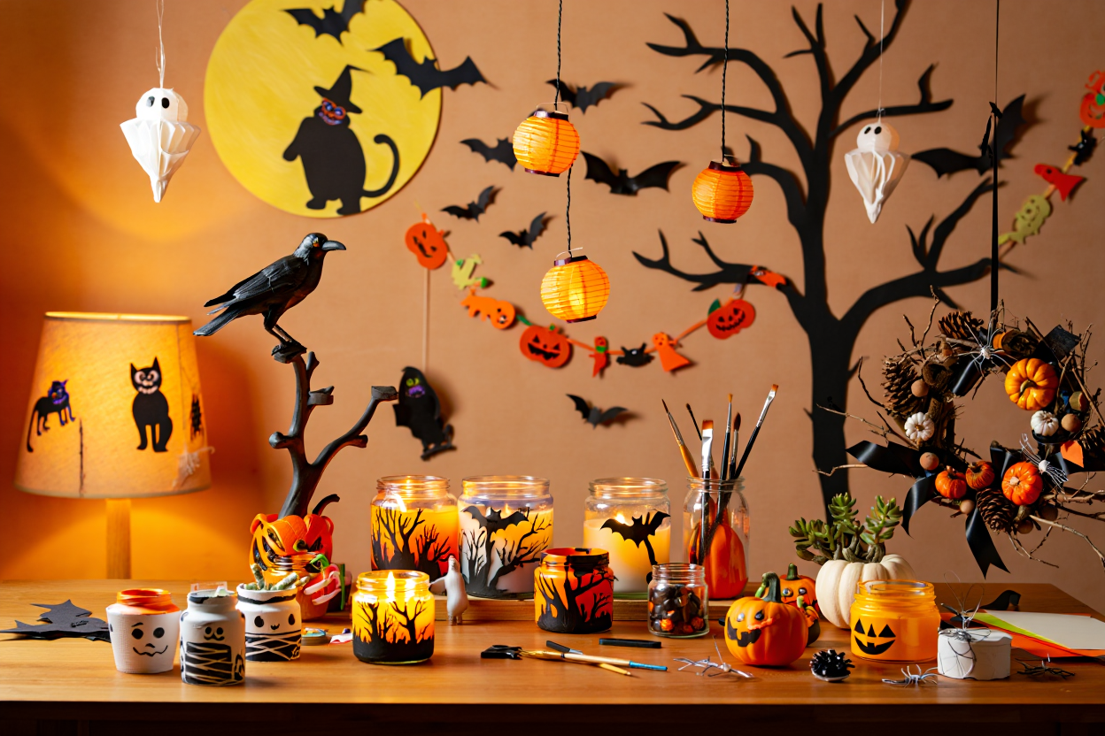 Бумажная гирлянда — классика, которую можно сделать за один вечер. Вырежьте из цветной бумаги фигурки тыкв, привидений, летучих мышей, черных котов. Чтобы они получились ровными, используйте шаблоны — их легко найти в интернете или нарисовать самим. Нанижите фигурки на прочную нить или леску, оставляя между ними равные промежутки. Развесьте над дверными проемами, вдоль стен или над праздничным столом.
