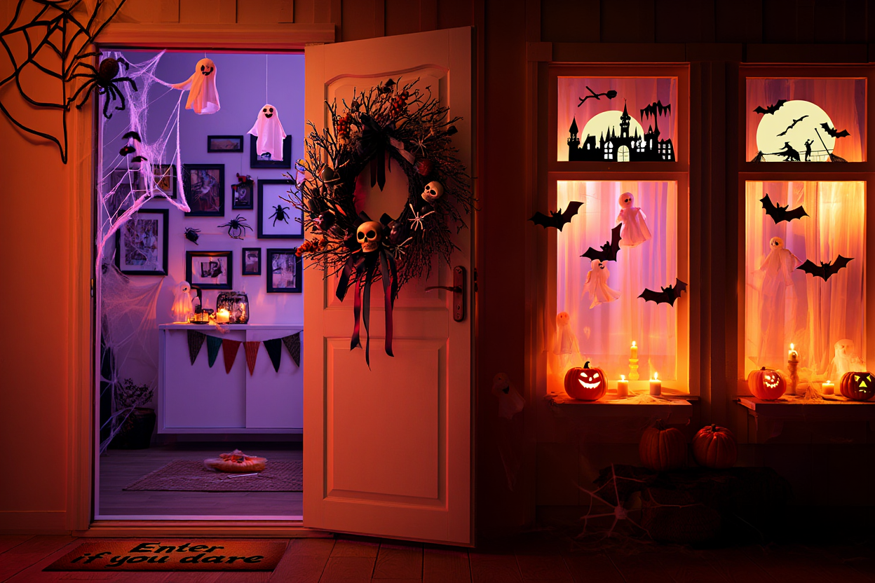 Входная дверь — это первое, что видят гости, поэтому ей стоит уделить особое внимание. Повесьте тематический венок из веток, украшенный искусственными пауками, черными лентами и миниатюрными черепами. Можно прикрепить к двери силуэты черных котов, ведьм на метлах или летучих мышей. Коврик перед входом с надписью «Входи, если осмелишься» добавит атмосферности.