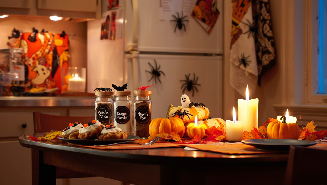 - Переклейте баночки со специями — напишите «Зелье ведьмы», «Порошок дракона», «Глаз тритона»